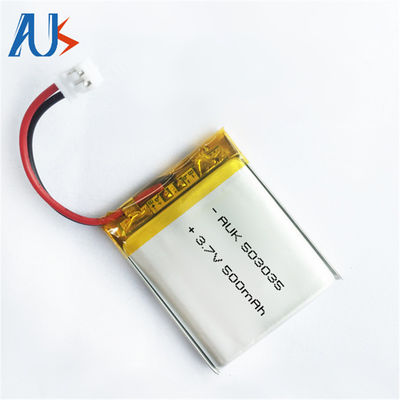 باتری پلیمر لیتیوم AUK 503035حداکثر جریان شارژ و تخلیه 1C (500mA) است.